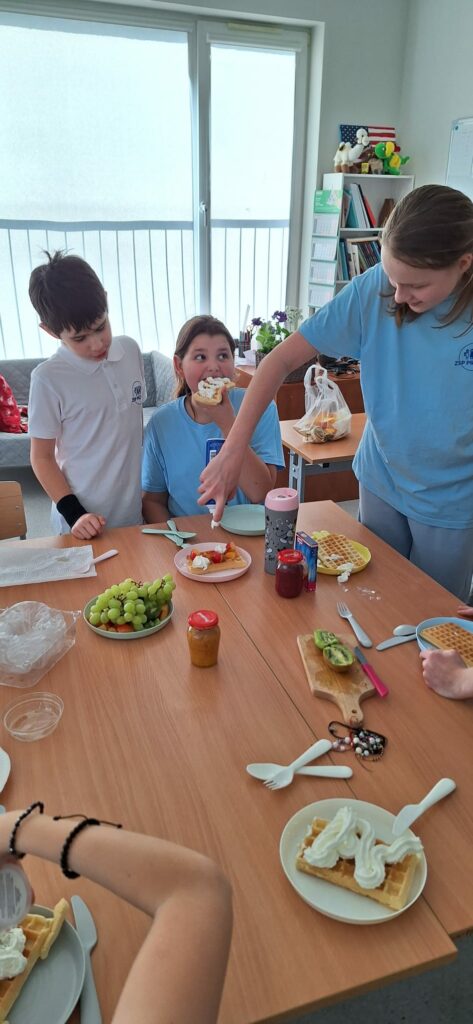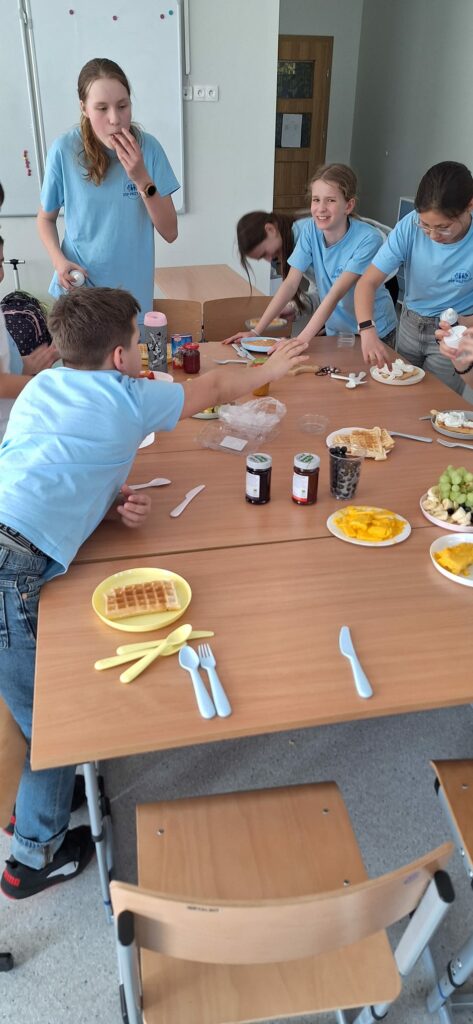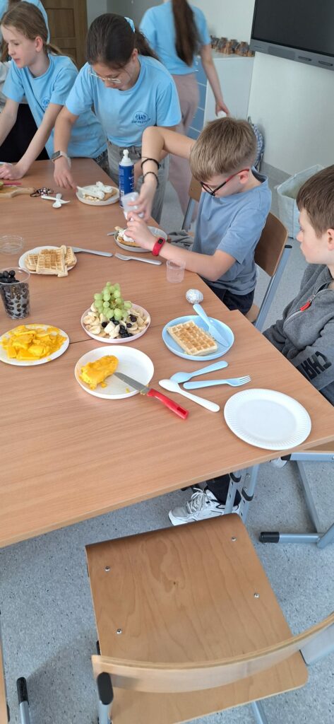 Pod okiem wychowawcy uczniowie samodzielnie upiekli gofry i udekorowali je ulubionymi dodatkami: świeżymi owocami, dżemem, miodem i bitą śmietaną. W klasie unosił się zapach słodkości, a uśmiechy nie schodziły z twarzy wszystkich uczestników.