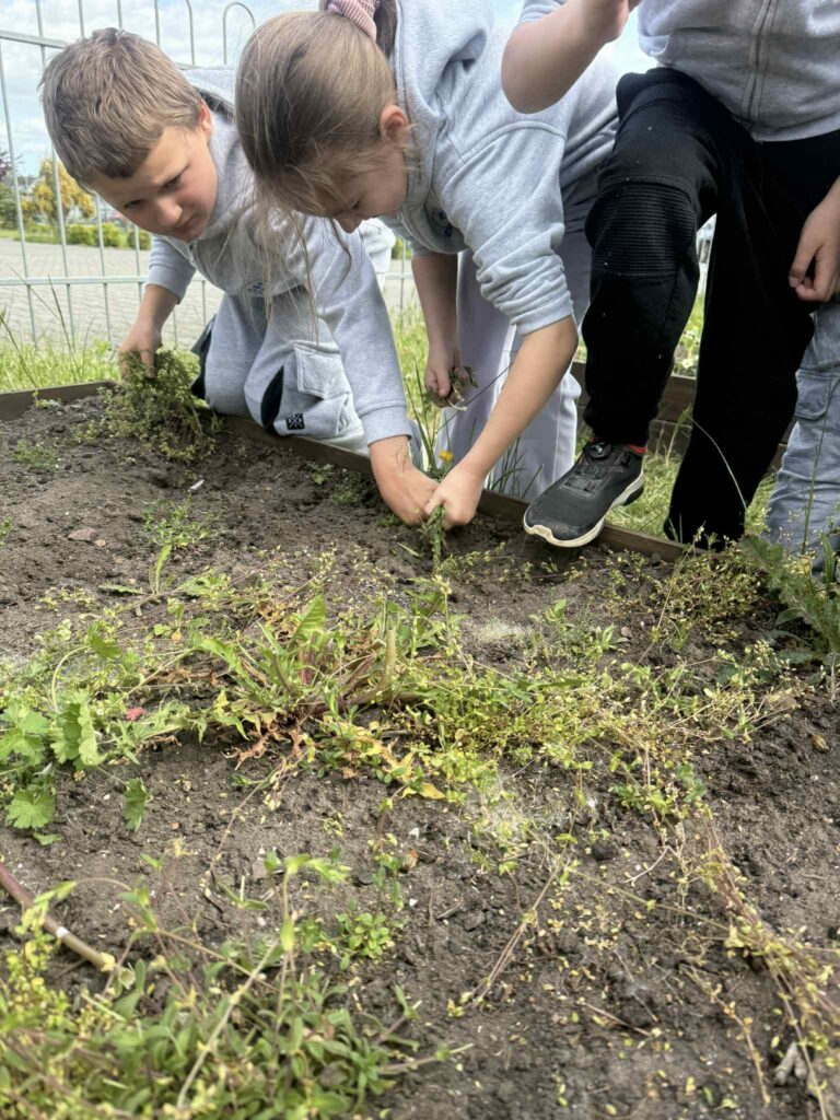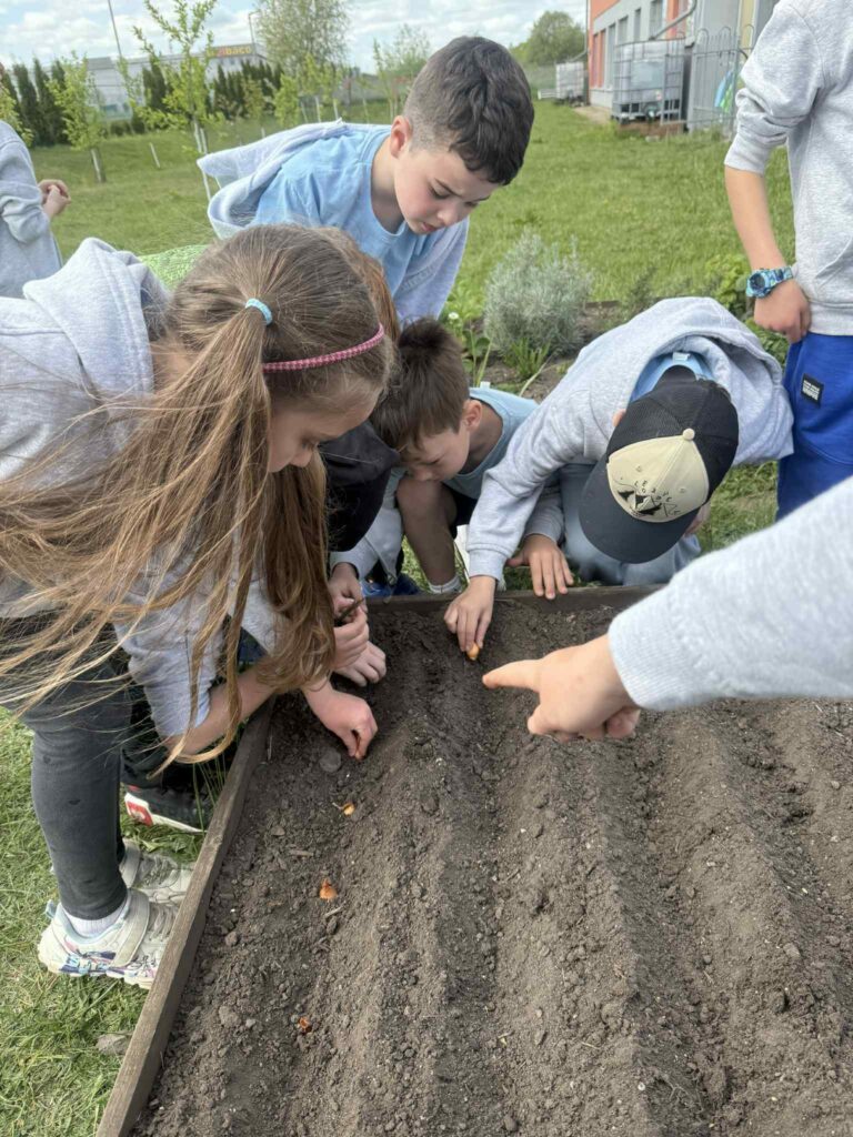 W ramach programu „Owoce i mleko w szkole” nasi uczniowie nie tylko uczą się zasad zdrowego odżywiania, ale również aktywnie uczestniczą w działaniach związanych z ekologią i dbaniem o najbliższe otoczenie. Pod koniec kwietnia, pod czujnym okiem pani wicedyrektor Urszuli Biskupskiej, dzieci zaangażowały się w porządkowanie klasowej grządki. Z wielkim zapałem usuwały chwasty, spulchniały ziemię i przygotowywały miejsce pod nowe uprawy. Następnie samodzielnie posadziły szczypiorek, który będą mogły później obserwować i wykorzystywać podczas zajęć kulinarnych lub w codziennych posiłkach. Dzięki takim działaniom uczniowie nie tylko zdobywają praktyczne umiejętności, ale też uczą się odpowiedzialności, współpracy i szacunku do przyrody. Cieszymy się, że możemy wspólnie tworzyć zdrową i zieloną przestrzeń wokół naszej szkoły!