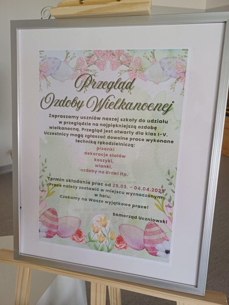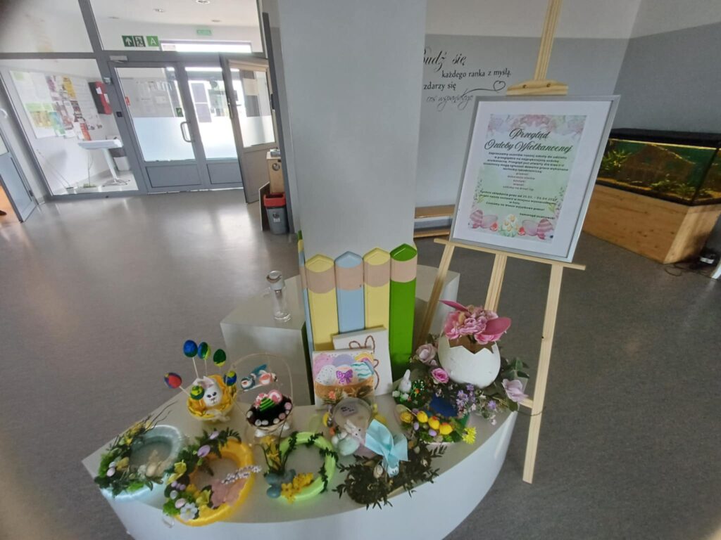 Samorząd Uczniowski zorganizował w kwietnia Przegląd Ozdoby Wielkanocnej. Tegoroczne wydarzenie przyciągnęło wiele kreatywnych i barwnych prac, które wprowadziły do holu placówki świąteczny nastrój. Uczniowie wykazali się pomysłowością i kreatywnością- wśród pracowników znalazły się koszyczki, figurki, stroiki, wieńce i ręcznie robione pisanki. Wszyscy uczestnicy otrzymali dyplomy i upominek za udział w przeglądzie. Dziękujemy serdecznie.