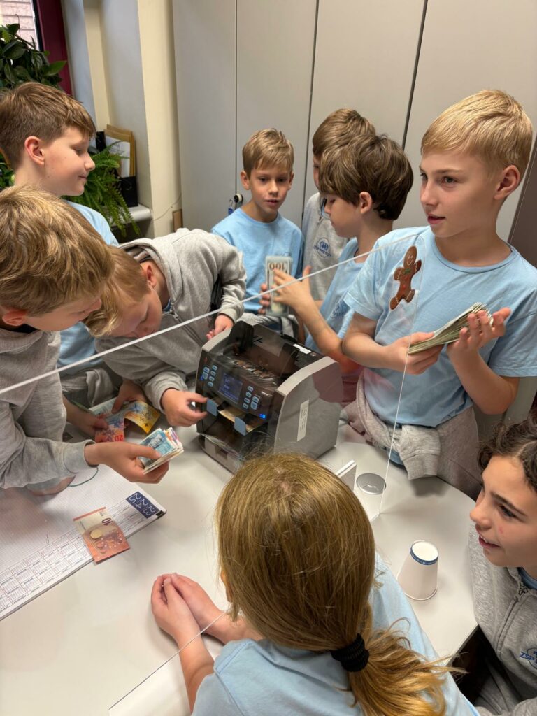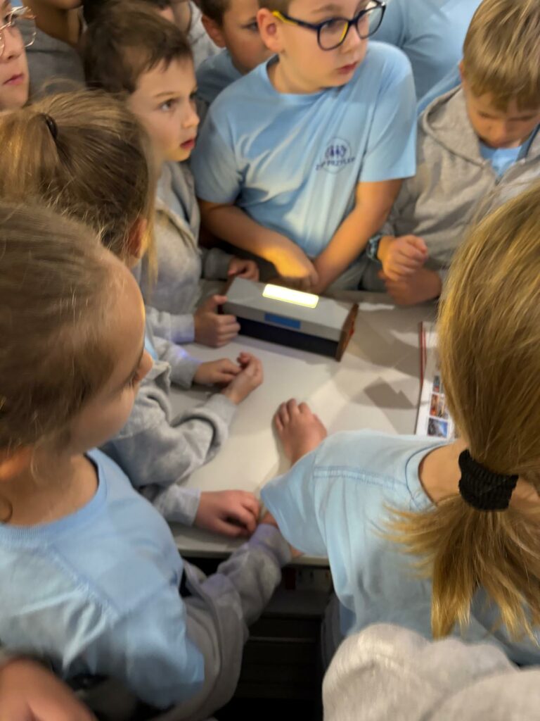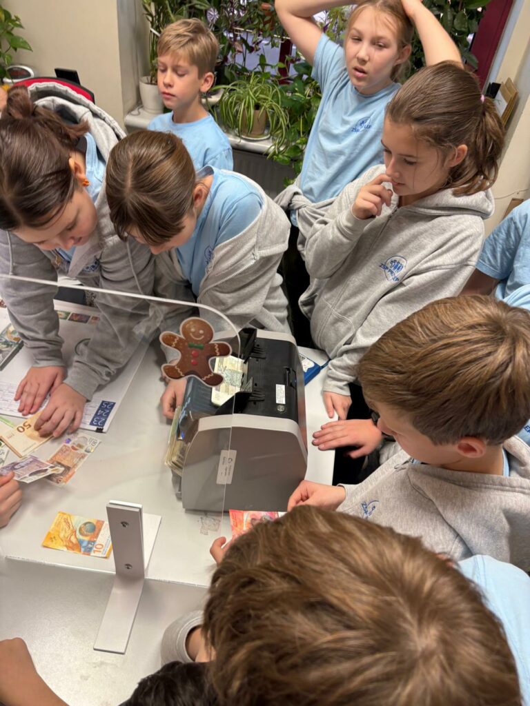 jak wygląda praca doradcy i kasjera bankowego, jaka jest wartość pieniądza i dlaczego warto oszczędzać, jakie są zasady bezpiecznego posługiwania się pieniędzmi, w jaki sposób można rozpoznawać autentyczność banknotów. Uczniowie mieli okazję samodzielnie: porównać prawdziwe i fałszywe banknoty, wykorzystując specjalne lampy i urządzenia, poznać waluty różnych krajów, sprawdzić autentyczność banknotów za pomocą profesjonalnych narzędzi, zobaczyć działanie maszyny do liczenia pieniędzy i policzyć przy jej pomocy przygotowane zestawy banknotów.