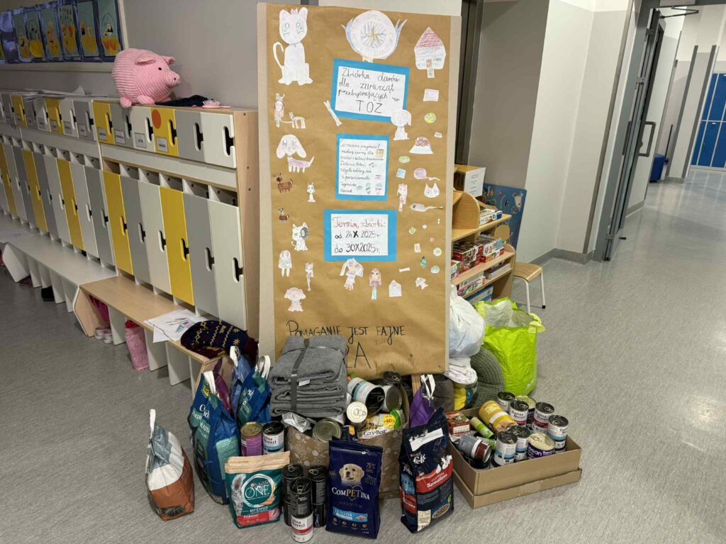 Z okazji Dnia Kundelka uczniowie klasy 2a zorganizowali zbiórkę karmy dla zwierząt na rzecz TOZ w Szczecinie. Dzieci z dużym zaangażowaniem przynosiły karmę oraz inne potrzebne artykuły, okazując empatię i troskę o los bezdomnych zwierząt. Akcja była połączona z realizacją treści edukacyjnych. Uczniowie klasy 2a kończyli omawianie lektury „Psie troski”, rozmawiając o odpowiedzialności za zwierzęta oraz potrzebie niesienia im pomocy. Podczas zajęć języka polskiego poznali również nową formę wypowiedzi pisemnej – ogłoszenie, które ćwiczyli, nawiązując do tematyki zbiórki. Działanie to spotkało się z dużym odzewem i było doskonałym przykładem łączenia nauki z wrażliwością społeczną. Uczniom oraz rodzicom serdecznie dziękujemy za zaangażowanie i okazane serce.