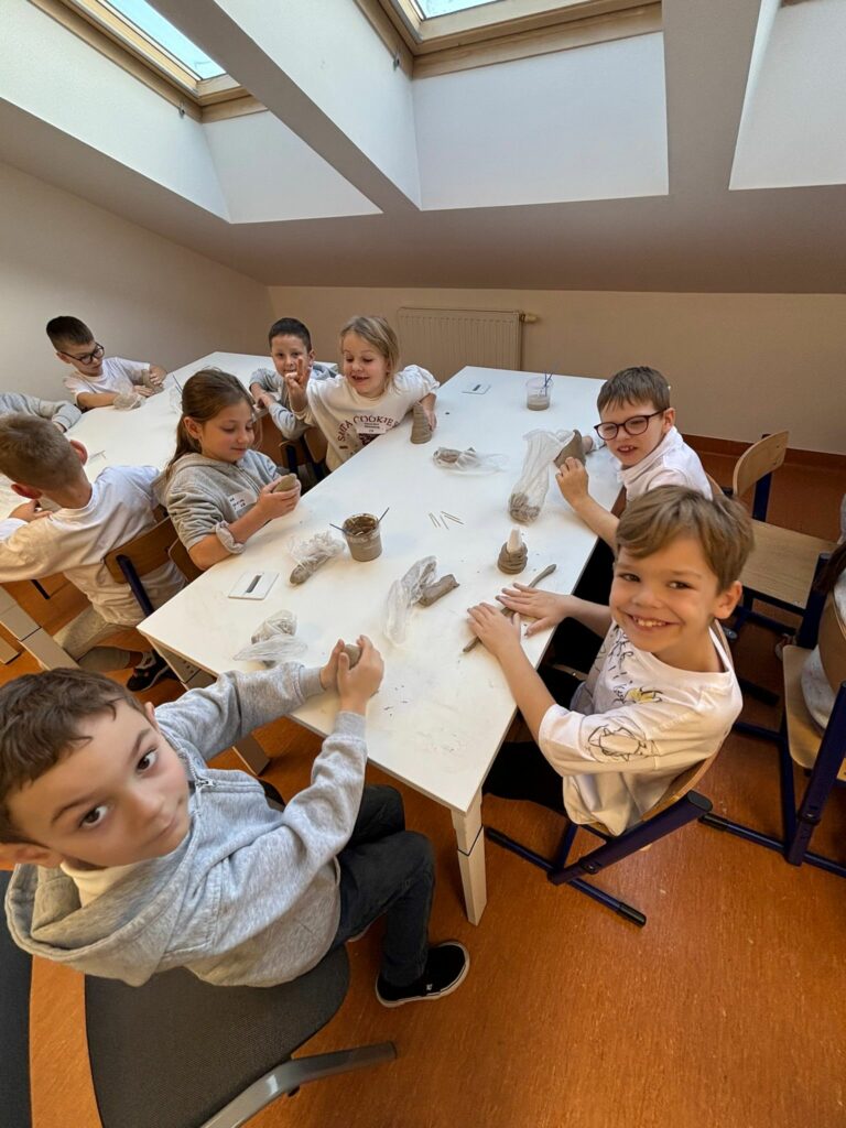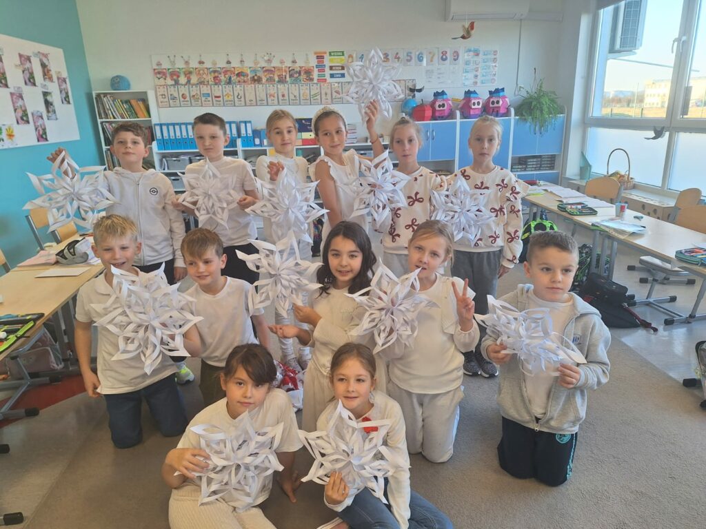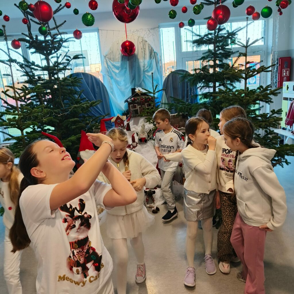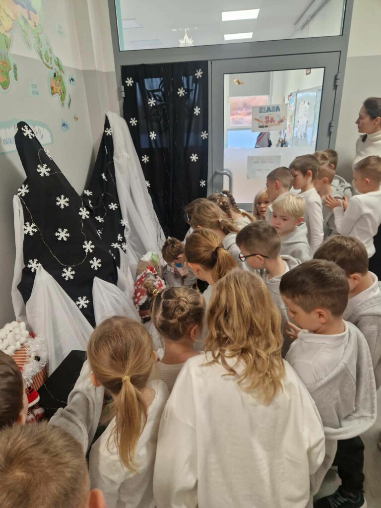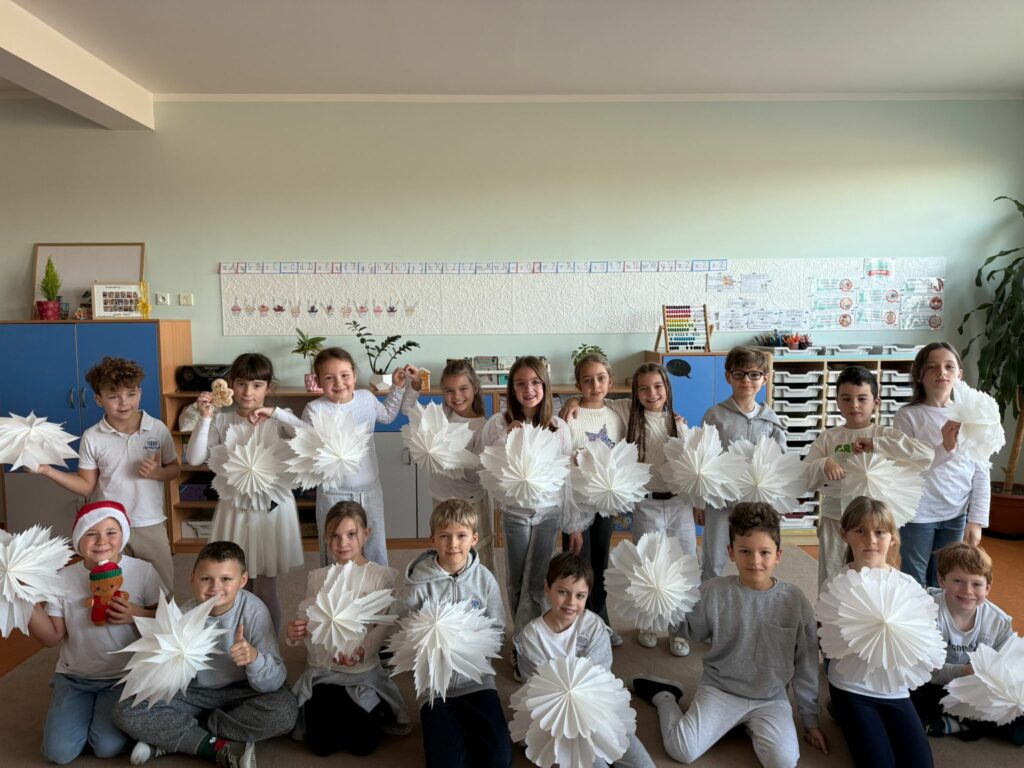 Chociaż za oknami aura jesienna, w naszej szkole zimowa atmosfera. Grudzień powitaliśmy ubrani na biało i w oczekiwaniu na święta postanowiliśmy wyczarować sobie śnieżne otoczenie. Klasy pierwsze uczestniczyły w warsztatach i tworzyły gliniane elementy. Klasy drugie i trzecie składały, wycinały papierowe śnieżynki oraz gwiazdki. Tak powstała zimowa dekoracja. Wszyscy świetnie się bawili. Z radością i ciekawością czekamy na kolejne kolorowe dni.